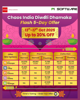 The festive season is the ideal time to invest in new creative tools, and PI Software has made it even better with the Chaos Diwali Flash Sale 2025. From 13th to 17th October 2025, Indian customers can enjoy up to 20% off on select Chaos products, including Enscape, V-Ray, Corona, and Anima. Whether you are an architect, designer, or visualisation professional, this Diwali deal offers you the opportunity to refresh your projects with professional-grade software.